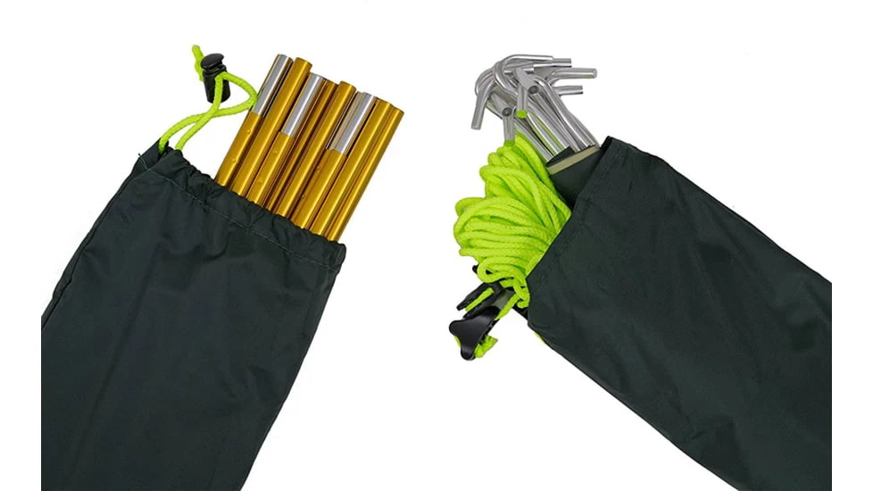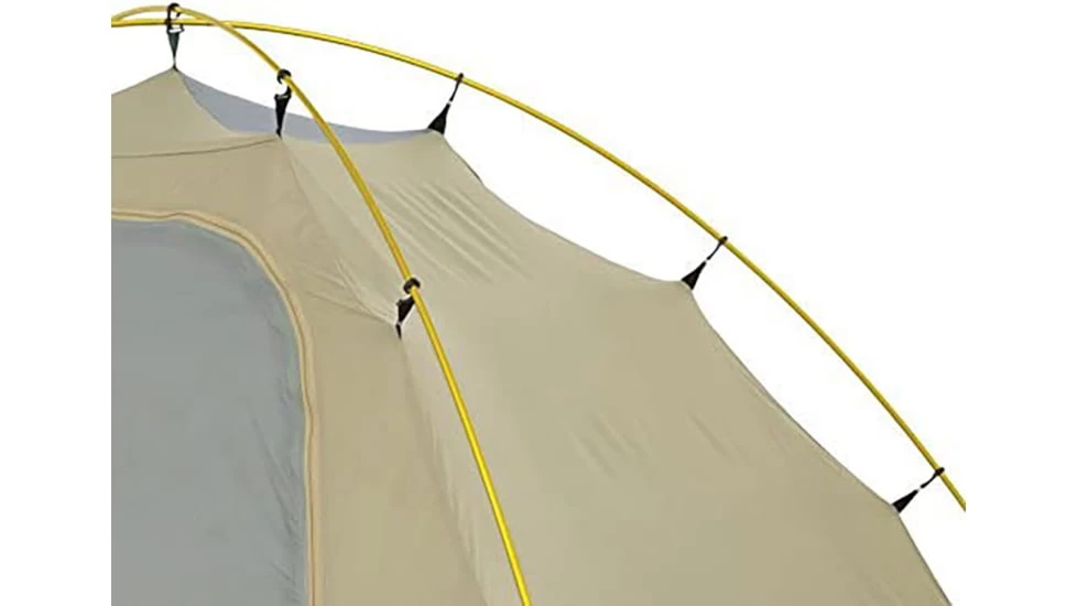 For poles, we use aircraft alloy 7000 series aluminum that are strong and lightweight. Assembly is really easy with the tent clips that just snap in place over the poles. The polyester fly and oxford floor are urethane coated, with factory sealed seams for maximum weatherproofness. The 2 doors make getting in and out of the tent much easier, especially in the middle of the night when you need to take a quick “break”. You also get 2 vestibules (one over each door) that you can use for extra gear storage. The vestibules also serve as automatic guy-out points when the weather gets a little nasty. The fly buckles to the tent, offering a much more secure attachment when compared to elastic cord. Mesh roof vents increase ventilation and improve star gazing.
