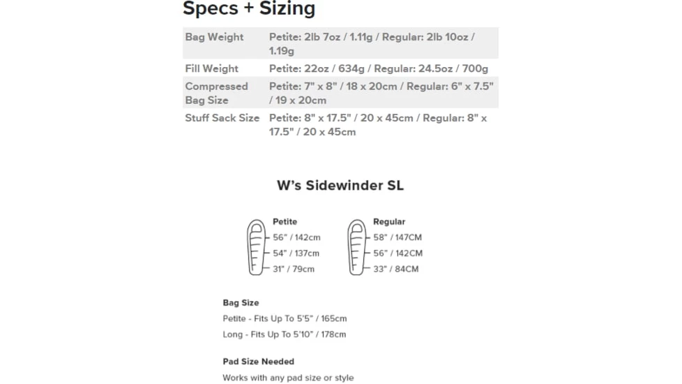 Specifically designed for those who sleep on their sides, the patent pending Sidewinder Series was engineered to ensure warmth, comfort, and ease of use no matter which side youre on. Constructed with features you expect from a traditional mummy bag with additional body mapped insulation to optimize warmth where you need it and minimize pressure points and other side effects. The Sidewinder SL is a side sleepers dream bag with technical features that roll seamlessly from one adventure to the next, and from one side to the other at night. Our Womens specific bags differ in shape and fill weight with a less drastic taper from shoulders, to hips, to feet – reducing cold spots and creating more warmth where it counts.![]()