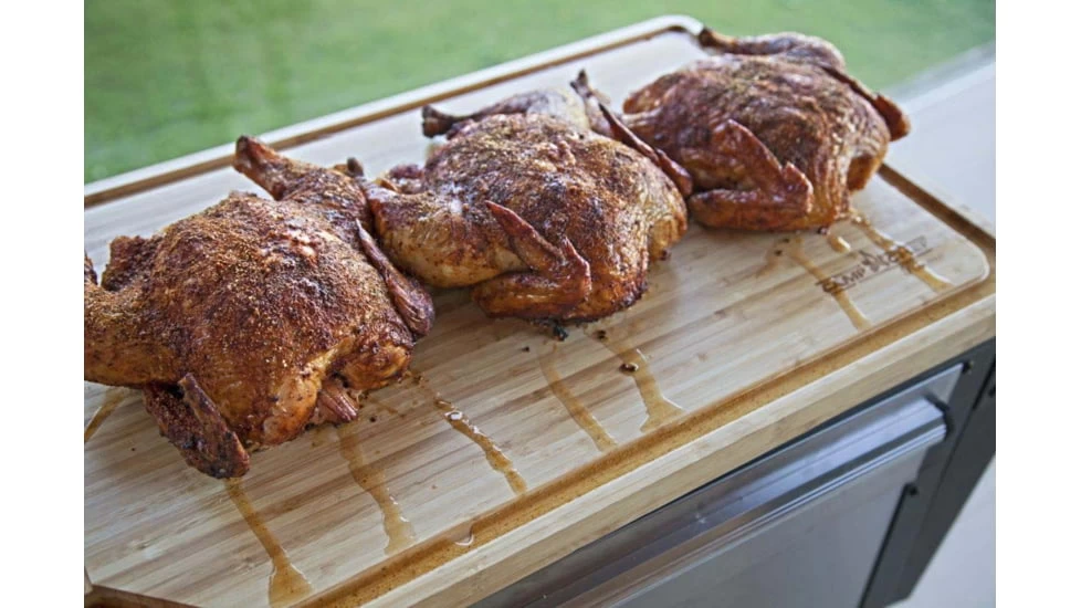 Channel your inner chef with the professional Bamboo Cutting Board. With 468 square inches of surface area, youll have plenty of room to prepare all your food, whether youre cooking veggies, ribs, brisket, ham, or more. This cutting board is specially designed with a deep groove around the outside for catching juices, keeping the mess all in one place. The beautiful bamboo also makes for great food presentationyou can use it to bring dinner right to the table. Try out the Bamboo Cutting Board with your Camp Chef Patio Cart or all by itself; youre guaranteed to love it either way.![]()