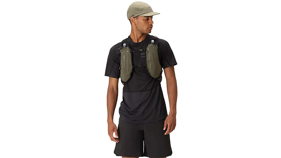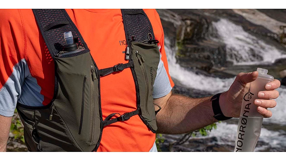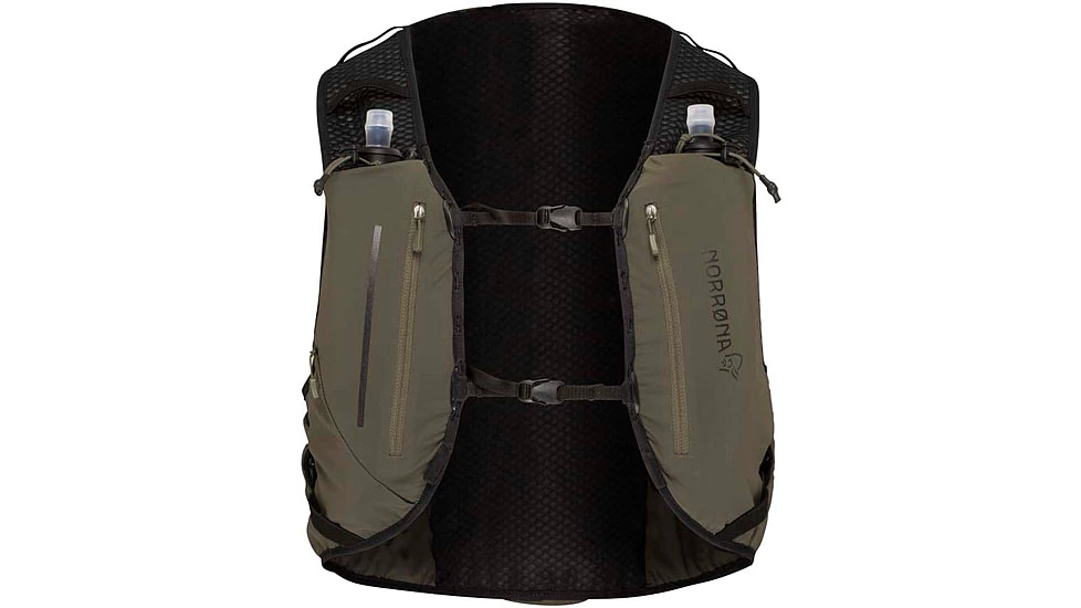 This pack is developed for trail running where extra clothing, energy and gear is needed. It also works great for mountain biking, light hiking or cross country skiing. This pack is ready to take care of all your necessities so you can keep your focus purely on nature. Specifically made for trail running, though it can be used for all of your outdoor activities that call for some extra hydration. The carrying system is developed to around 3 functions. Great breathability, great stability and comfort, easy access to water, energy, gear, without taking off the pack. Two 500 mL norrna soft flasks included stored in the easy to reach front pouches, pocket for drinking system inside main compartment, three chest pockets, open pockets at the sides for easy access to gel and energy bars, storage functions in both the front and back to hold poles when not in use. two adjustable 10mm straps with quick release snaps and drawstrings at the waist to regulate fit, safety flute, inside pockets for storage and key hook. This pack has a technical fit.![]()